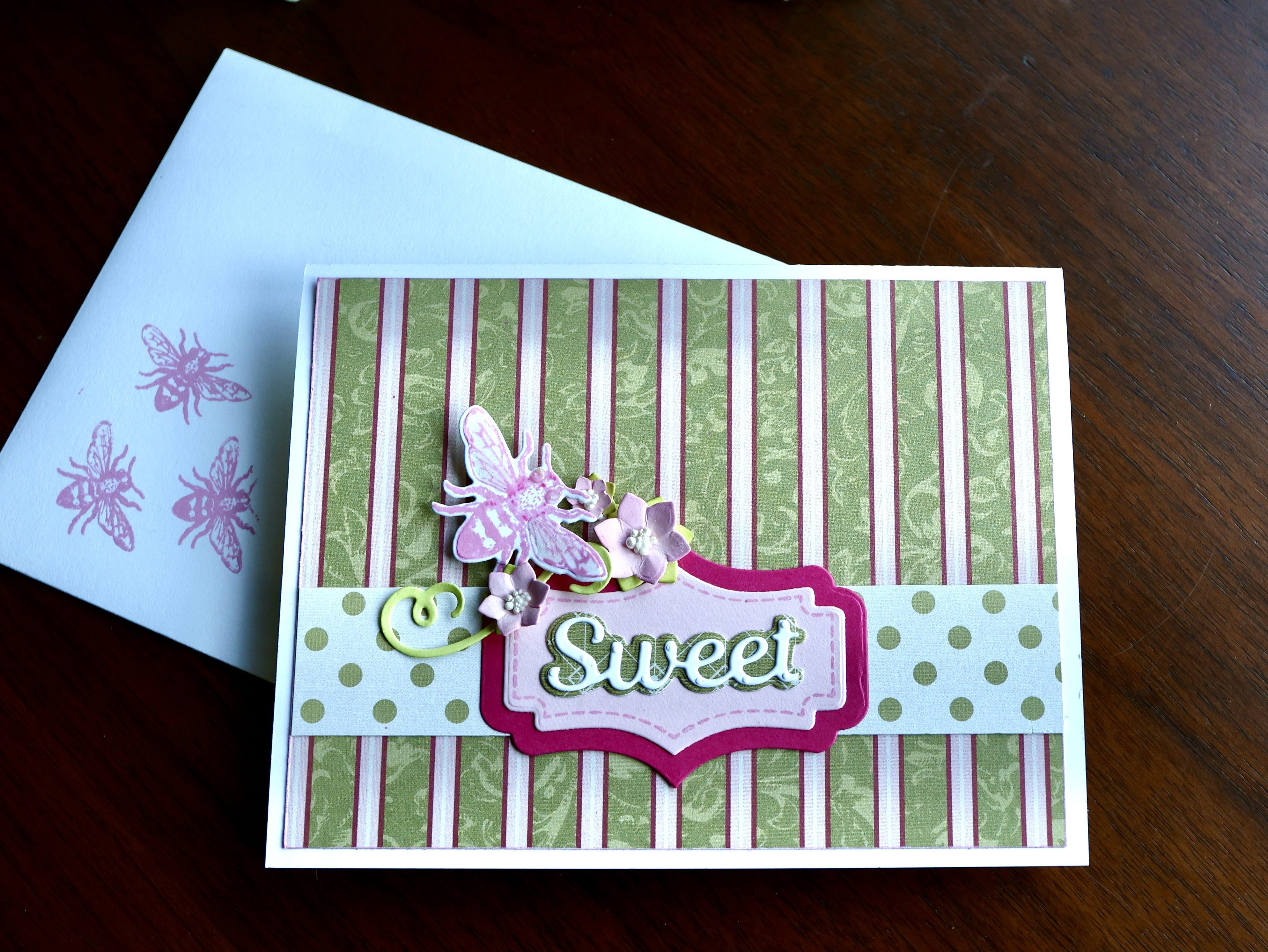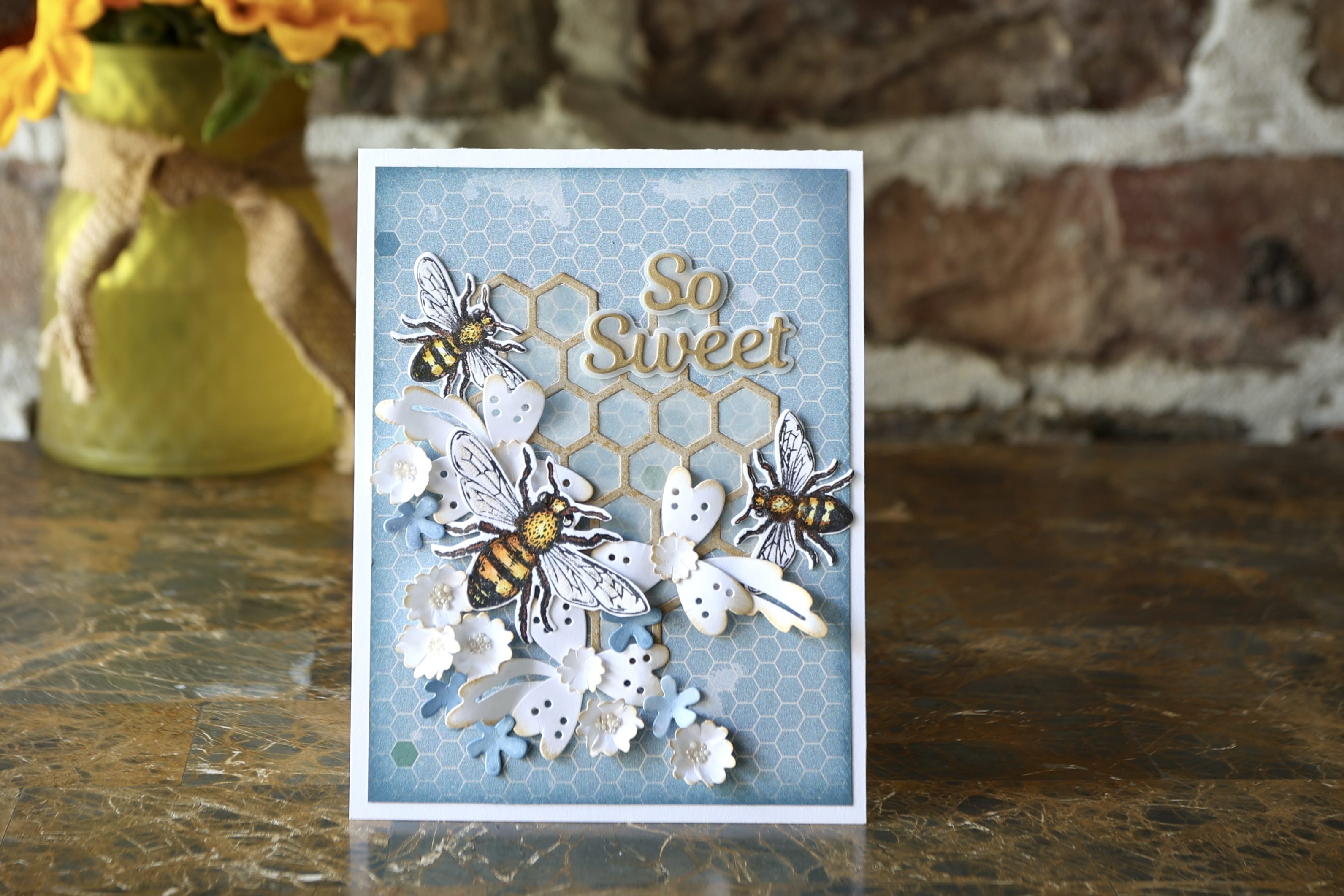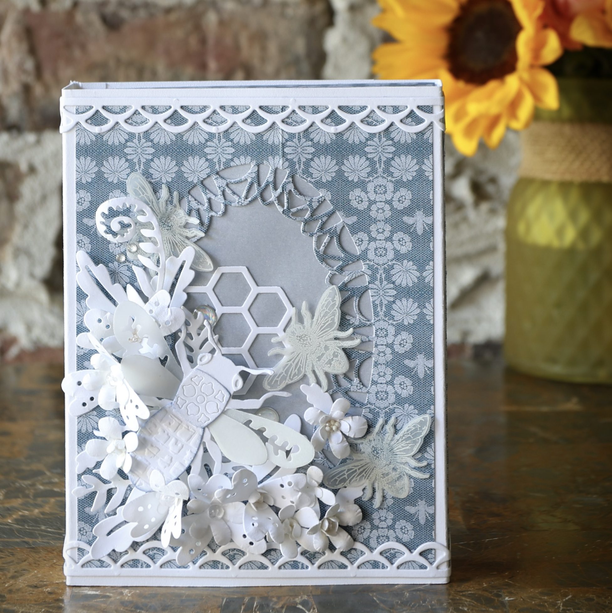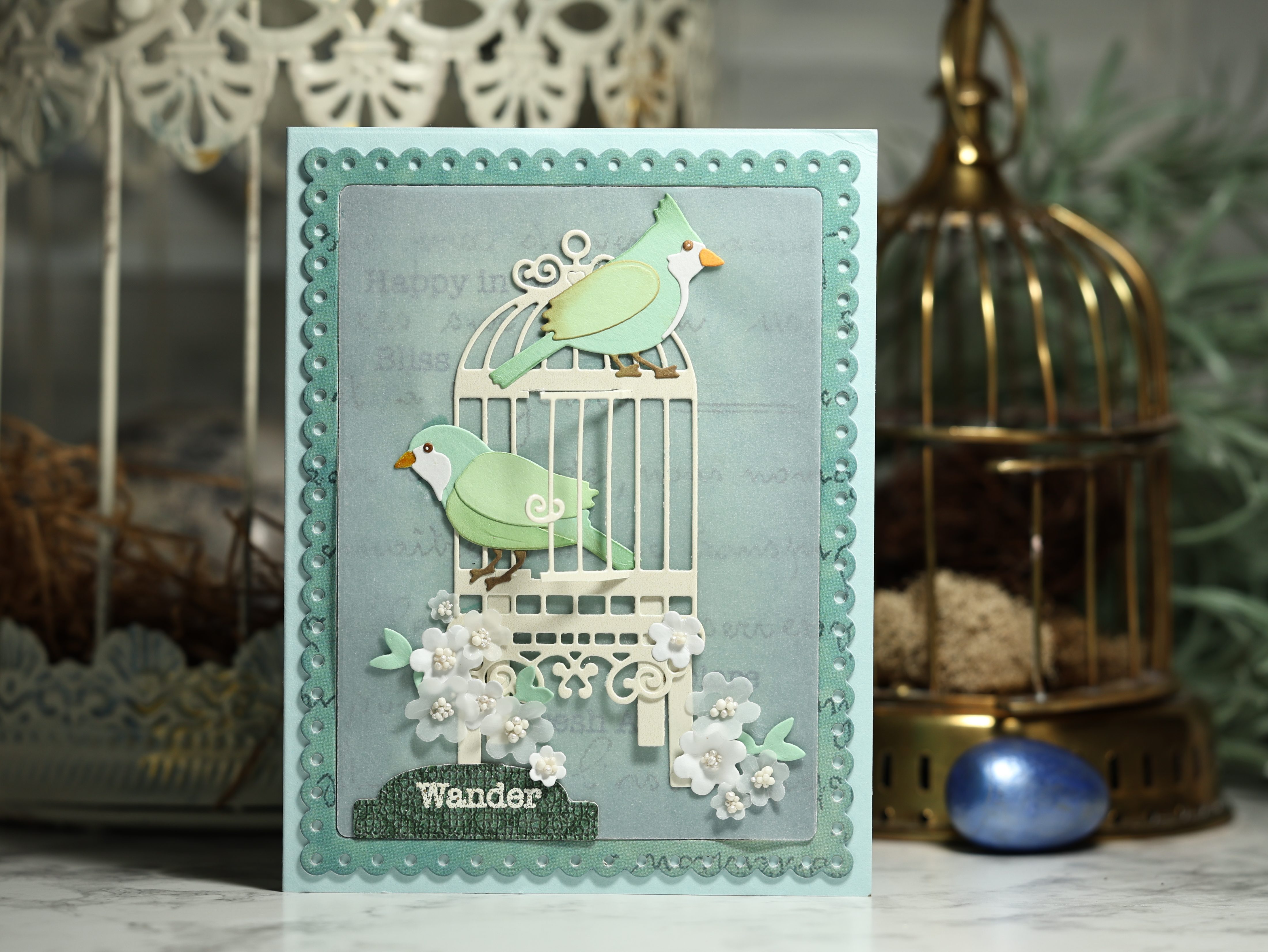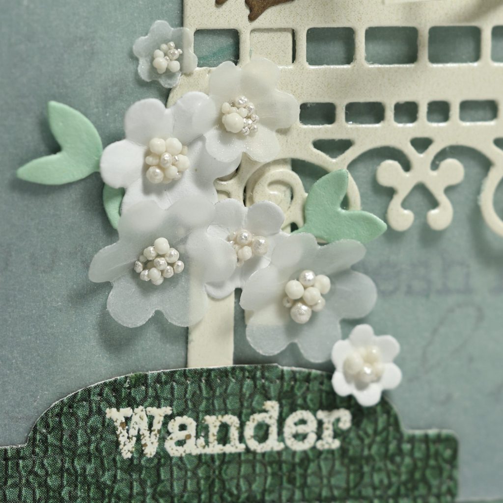 The card background is from the Beautiful Bounty paper pack. A frame was die-cut using the Card Maker Special Kit. I placed vellum over the background, but not the frame, to soften the colors. Tiny white and vellum flowers were cut, quickly shaped with a ball stylus, and arranged around the cage. White Prills add nice texture to the flower centers.