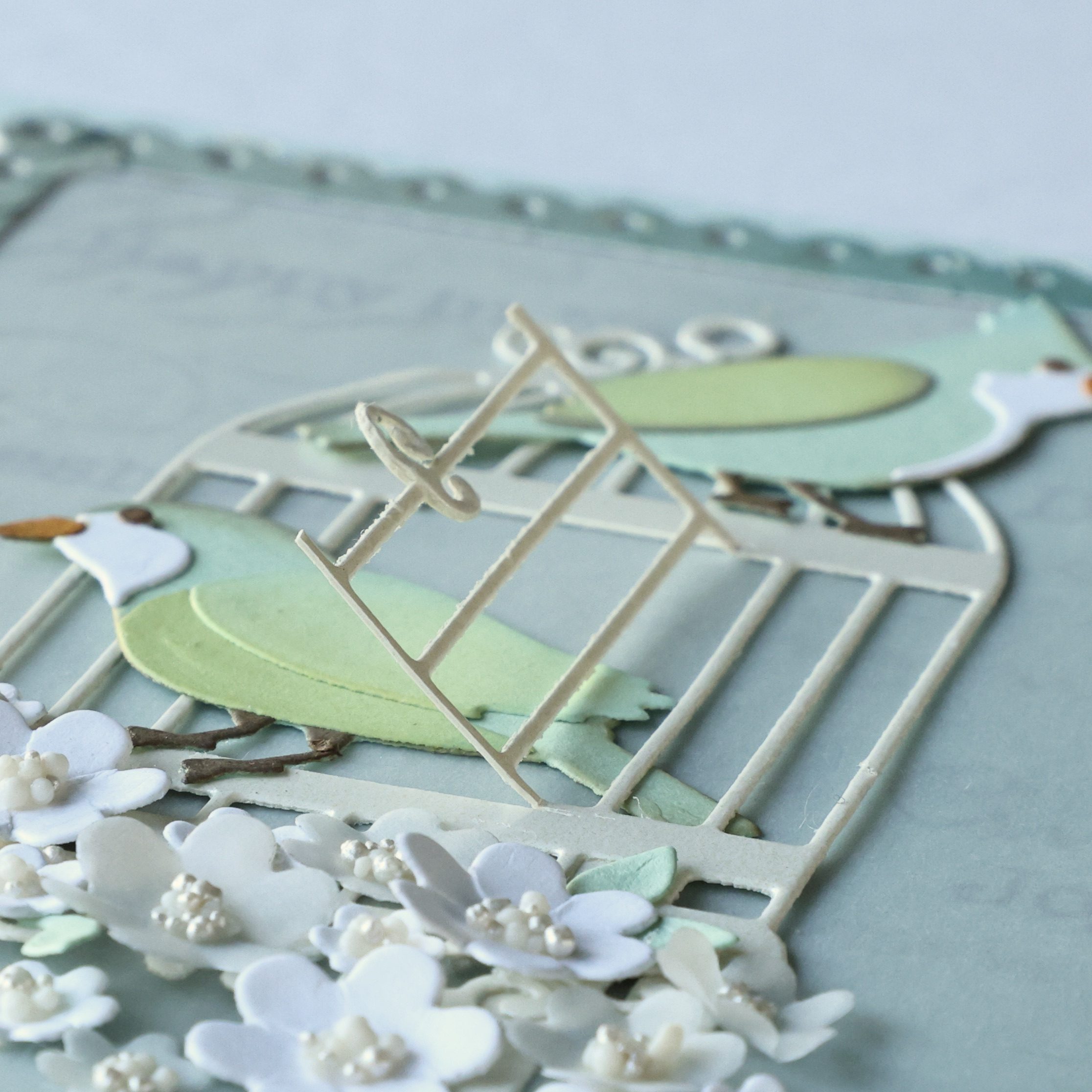 My birds are cut from two shades of green cardstock and lightly colored with distress oxide for a bit of shading.