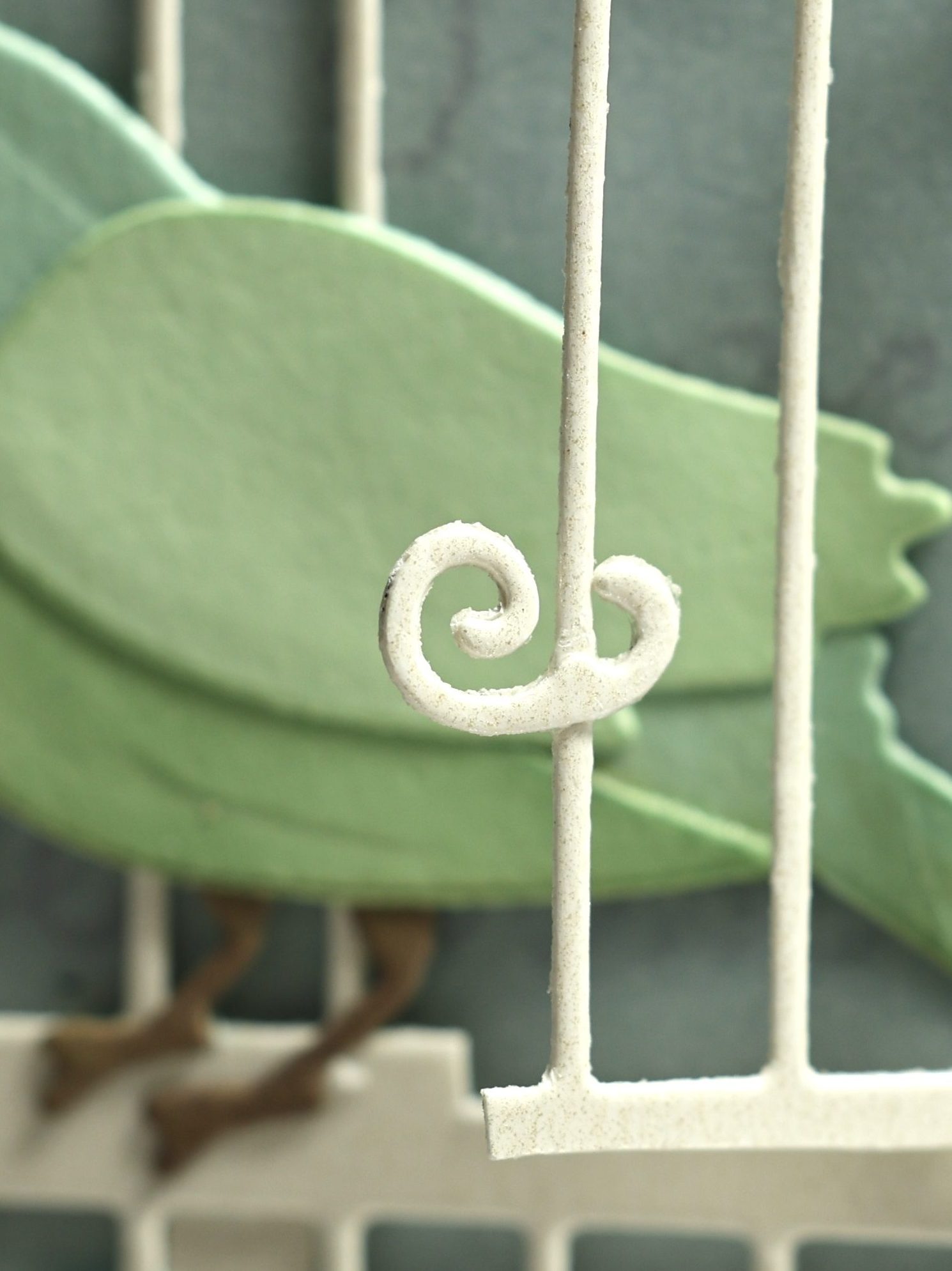 The handle to the cage door was made with the negative pieces from the decorative top of the cage; shown in the center photo below. One “handle” is on the front of the door and the mirror image is adhered to the back of the door. That helps the handle stick and has a finished look when the door is open.