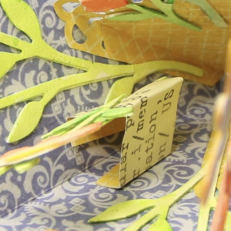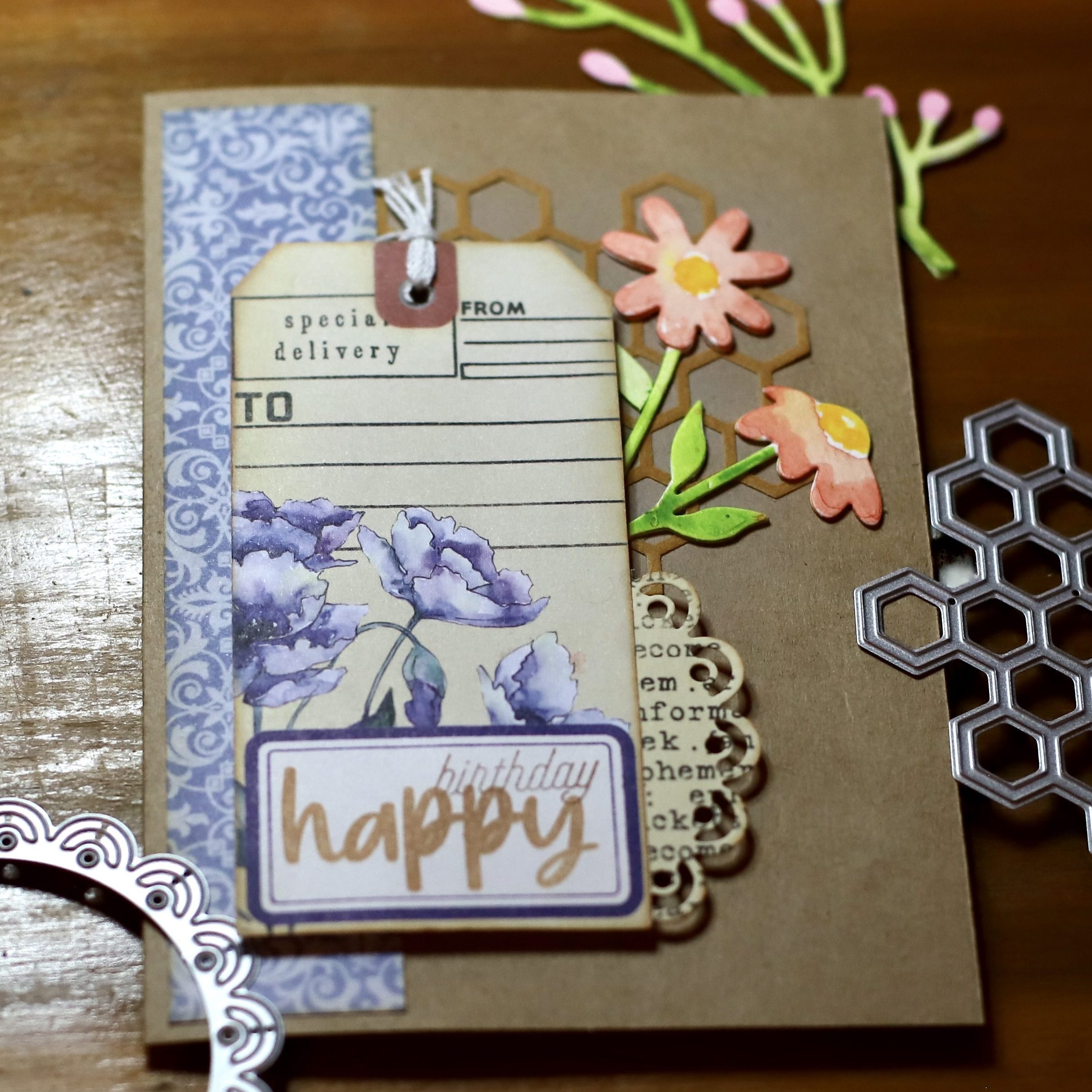 I stamped and embossed yellow 2.25″ x 3.25″ paper with the honeycomb stamp then cut it with the dripping Mason Jar die to create dripping honey. I popped that up onto a black 2.25″ x 3.25″ rectangle, added part of a gold honeycomb die-cut, a small bee, embellished it, and splattered with gold watercolor.
