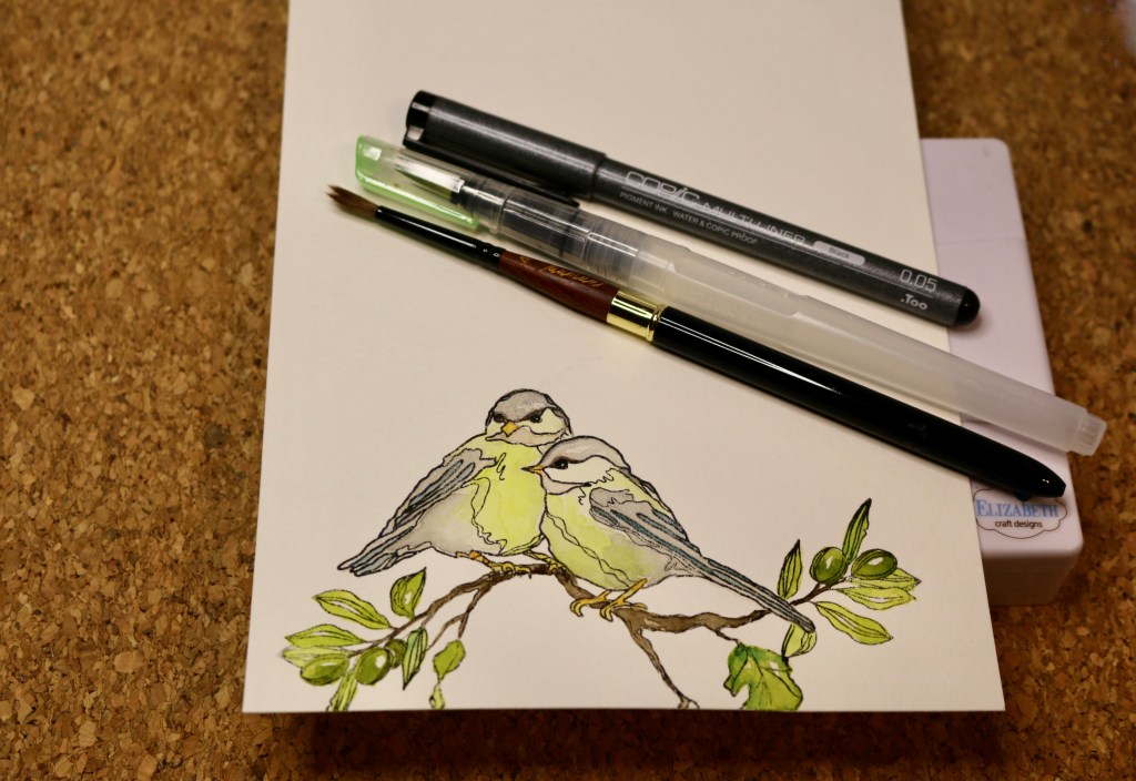 I didn’t take a picture, but mask over stamped areas that you want to protect, then stamp in the foliage. You can even place small amounts of mask, like I did here on the tail, to protect little areas. With a pencil, faintly draw in branches for the birds feet to rest on or to connect to the foliage. Then go over the pencil with a very thin Copic liner or another water resistant marker.