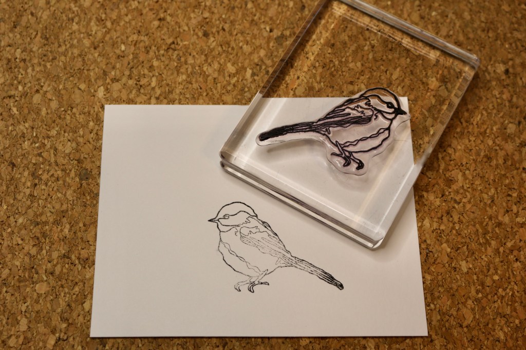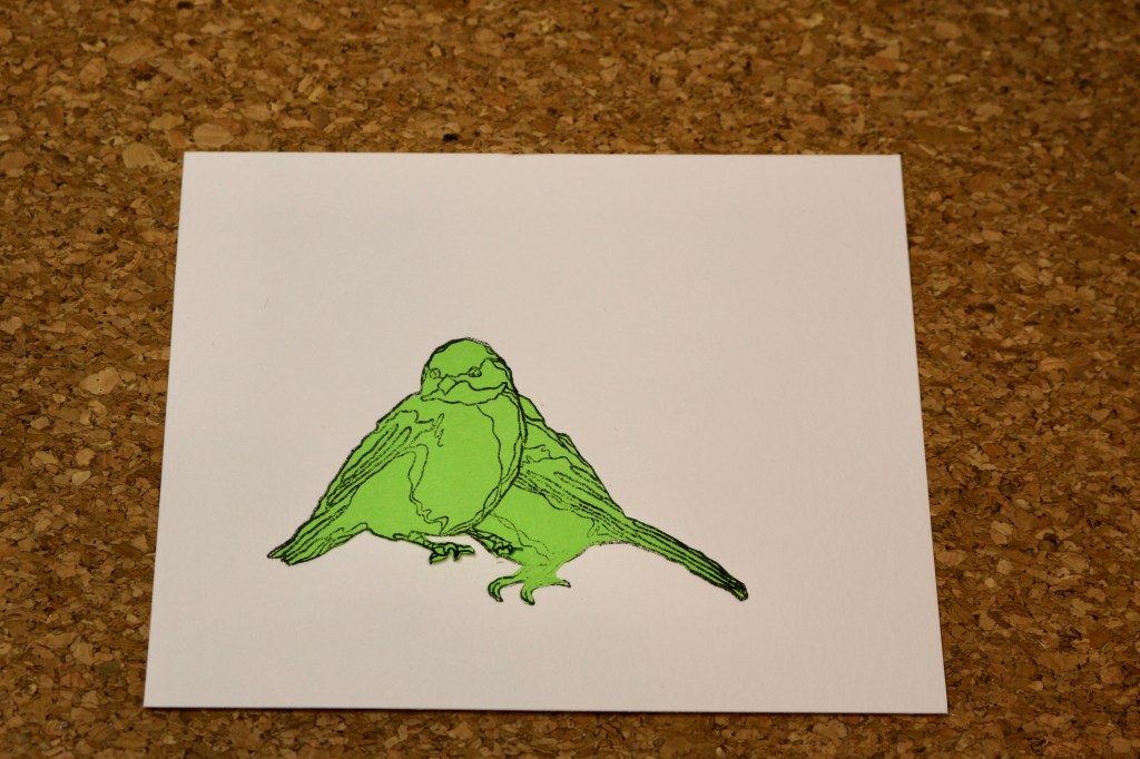 Stamp the second bird image over the masked bird (this isn’t shown). Stamp and cut a mask of this bird, too. Place the mask over the new bird as pictured.