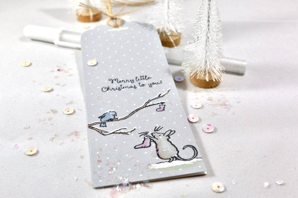 Colorado Craft Company’s stamps by Anita Jeram made this tag super quick to make. The tag was cut from Waffle Flower Half Dot patterned paper, stamped, then colored with light Copic marker colors. Snow was added with a gel pen.