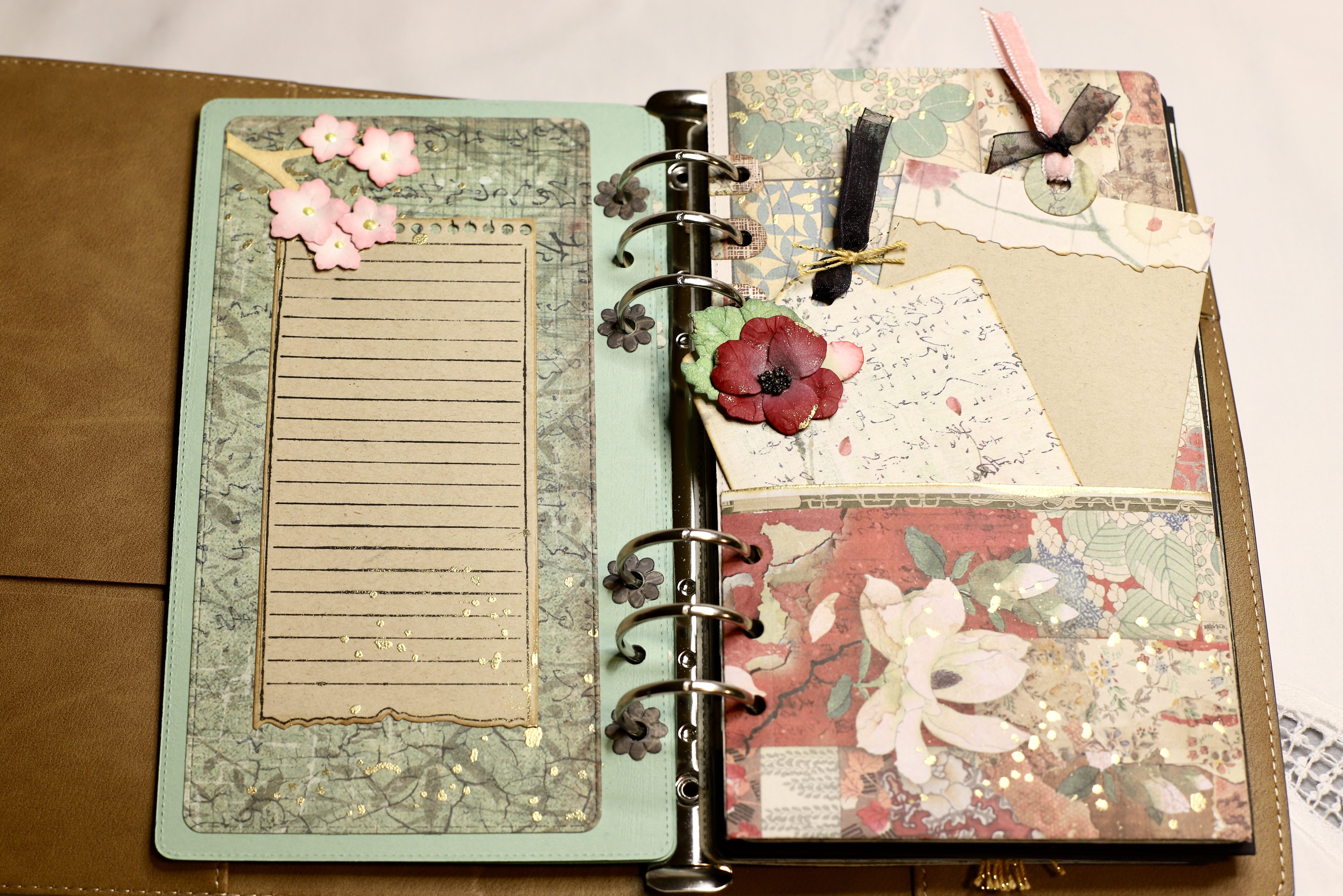 I added pockets to several pages and created tags adding embellishments of shaped flowers, ribbon, and gold embossed accents. Besides adding interest, it seems like heat embossing would strengthen the edge of the pockets.